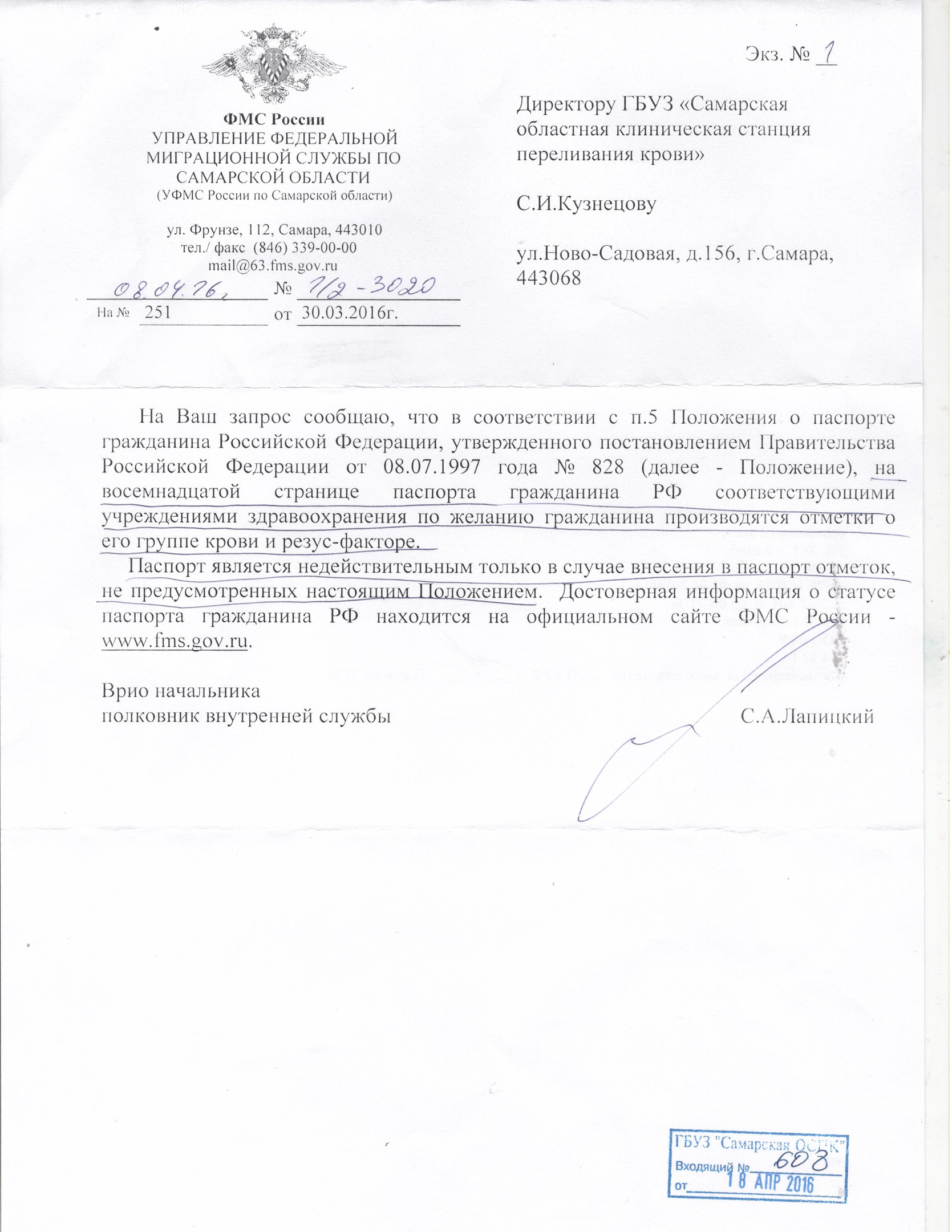 Отметка в паспорте гражданина РФ о группе крови и резус-факторе